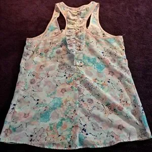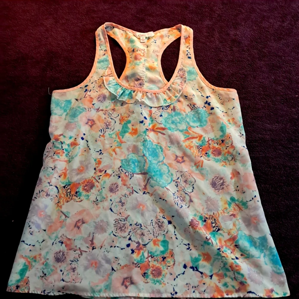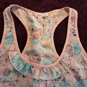 Add a touch of femininity to your wardrobe with this Candie's floral ruffle tank. This size small top features a delicate floral pattern and charming ruffles that create a flattering silhouette. Perfect for layering or wearing on its own, this tank is versatile enough for both casual outings and more dressed-up occasions.