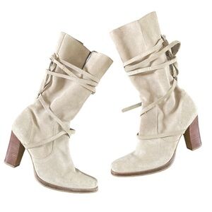 Mid High Vtg Candies Suede boots featuring a wraparound tie, stacked wooden heel, side split calf notches. Gorgeous neutral boots to wear to your next festival concert.