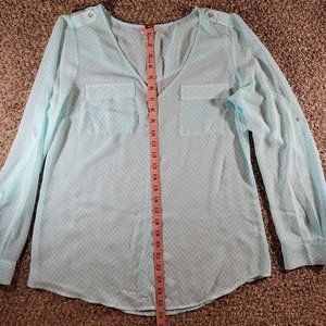 Gently used, good condition, women's Candie's sheer chiffon long sleeve blouse with the ability to roll up sleeves in size large.