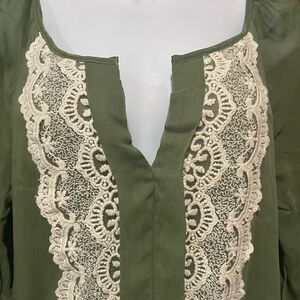 Green sheer top with long fathered sleeve, V neck and lace detail from neckline to bottom hem.