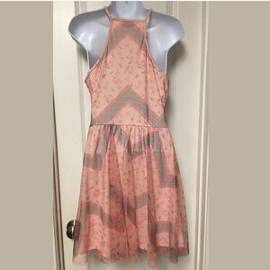 Juniors Candies brand Sleeveless peachy pink short dress with sheer layer over solid liner. Chevron/leaf pattern.