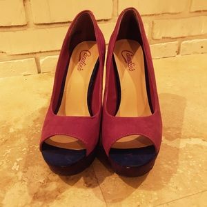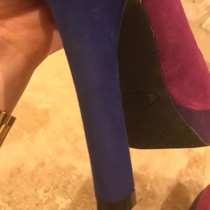 Magenta and Royal Blue block coloring High Heel Stilettos. Only worn once or twice. Slight nick on left front of shoe and slight scratch on right heel. Both pictured.