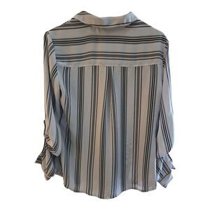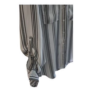 Elevate your wardrobe with this chic striped button-up blouse. Perfect for any occasion, this top features a classic design with a modern twist. The black and white stripes add a touch of elegance to your outfit.