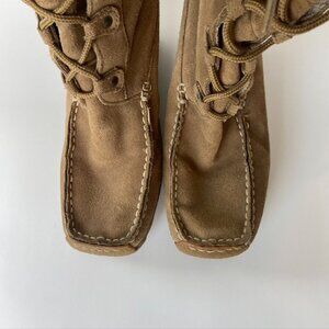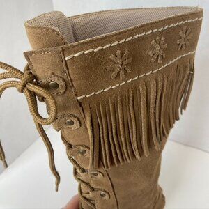 Candies Vintage Tan Suede Fringed Boots Sz 7.5. See photo for height. Small spot on side of the right boot as indicated in photo. Here are your new favorite vintage, retro wedge heeled boots, with fringe and leather embroidery at the top of boots. Lace up fronts, rubber sole. See photo for a small area where rubber heel is slightly curled back. Perfect for festivals, concerts, rodeo, or going out.