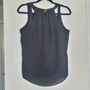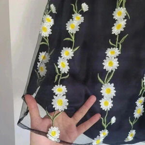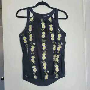 Black Sleeveless top with white and yellow flowers across the front.