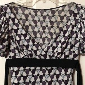 Candie's, Blouse for women, size small, white top with multicolored purple, silver and black dots, black tie around back, V-Neck.