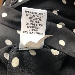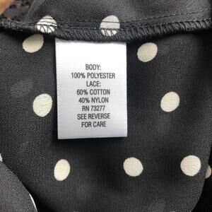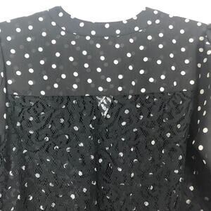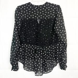 Polka dot black/white button down top. Long sleeve. Tie front. V-neck. Semi transparent fabric. Lace in back. Great used condition. No stains, tears or holes.