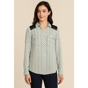 Add a fun twist to your wardrobe with this Candie’s women’s blouse in size XS. It features a trendy geometric triangle pattern in teal, black, and white, with stylish black lace shoulder accents for a chic touch. Lightweight and versatile, it has a button front, dual chest pockets, and a flattering high-low hem. Great for both work and casual wear!