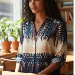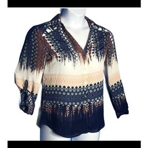 Candie’s Y2K hi-low floral blouse in size Small. Features a blue, pink & white floral print, cut-out collarbone detail, and a deep V-neck with darted bust for a flattering fit. Long sleeves with button cuffs (can be rolled). Button-down style with a hi-low hem adds retro flair. Lightweight 100% polyester. Excellent used condition.