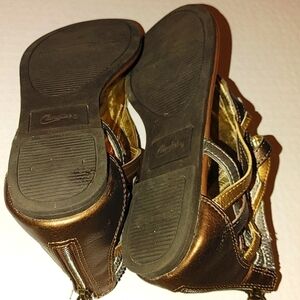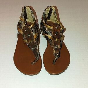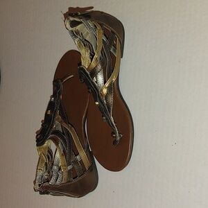 Candies brown, silver and gold thong sandals w back zipper. Size 6