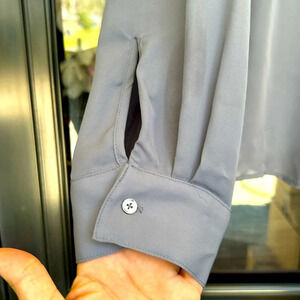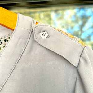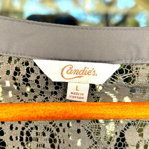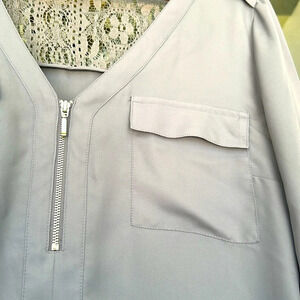Candie’s gray blouse, kinda sheer and has lace on back top. Zipper front. Roll up sleeves with the button. Really pretty and feminine blouse!