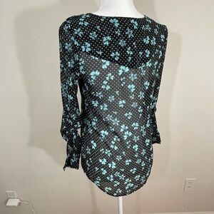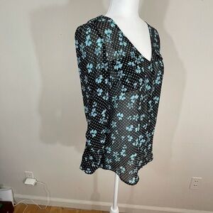 Very cute lightweight top in a black with green print. Button down Long sleeves. Pretty sheer fabric. Casual or dressy. Accurate sizing. EUC. No visible flaws. Any questions please ask. Will answer questions as soon as possible