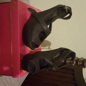 Black Leather, strappy wedges, very gently worn, open-toed, candies brand, excellent condition