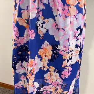 Charming maxi dress with floral pattern. Features a mix of blue and pink hues. Ideal for casual outings or special events.
