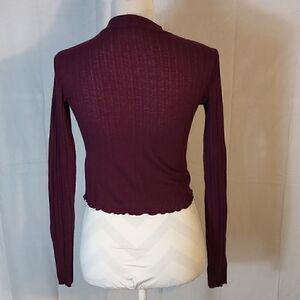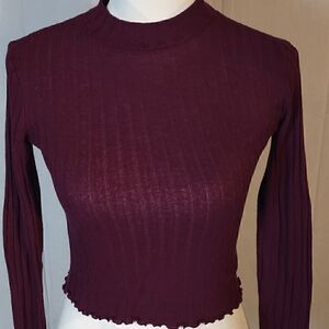 This maroon long sleeve mock neck Candie's cropped knit sweater is a size XS with a pit to pit measuring 17" and a length of 18.5". In excellent condition. All offers are welcome.