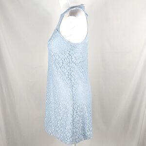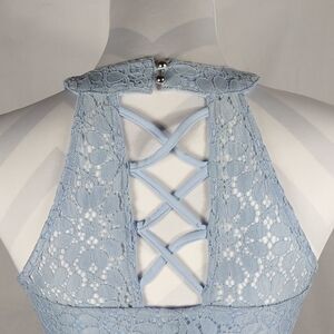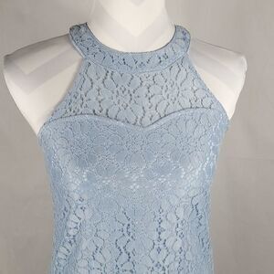 This blue Candie's floral lace halter mini dress is a size XS with a pit to pit measuring 16-1/2" and length is 32". It has two button and hoop closures in back. Fully lined. Shell: 90% nylon and 10% spandex, Lining: 100% polyester and machine washable. Pre-owned and in excellent condition. All offers welcome.