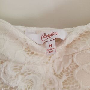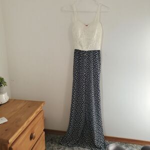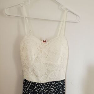 Lacy white spaghetti strap top half and navy blue with white flowers bottom half