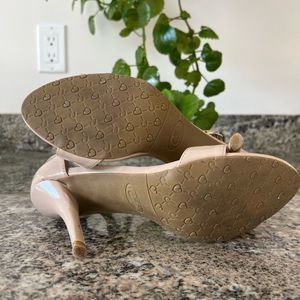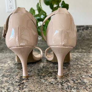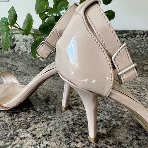 Size 7.5. Tan faux patent leather ankle strap heels. Worn only a few times - great condition!! Small stain on strap of left shoe. Great to dress up or down! 💋 for me they were comfortable to wear:)