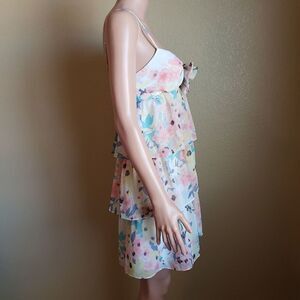 Like new! Pastel tiered floral dress with adjustable spaghetti straps and padded bra type top and a large bow front and center.