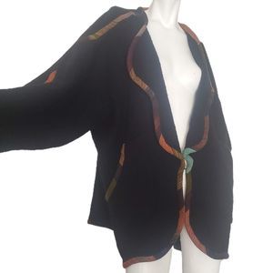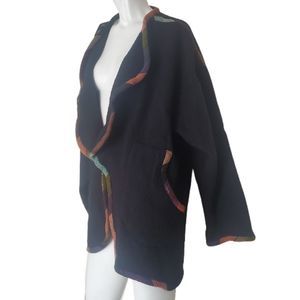 Wool blend. Thick-ply, patch pockets, "crayon trim" hem and cuffs.