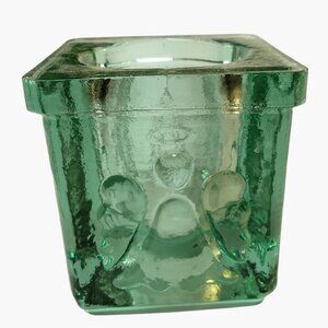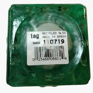 Enhance your home decor with this unique square candle holder. Crafted from recycled glass, its striking green hue and abstract design make it a standout piece.