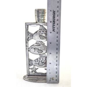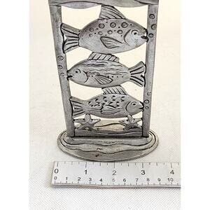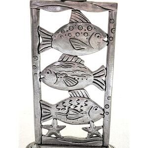 Pewter candle holder. This is 7" tall and shows 3 fish with 2 star[fish] at the bottom. It narrow when turned sideways. It holds one taper candle.