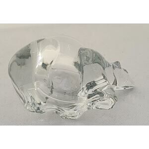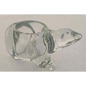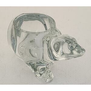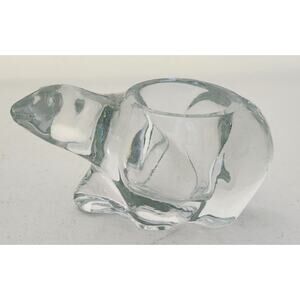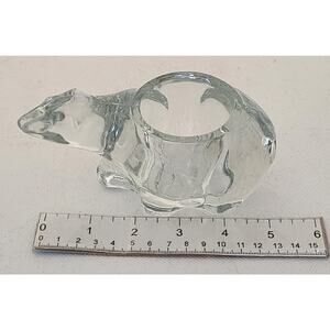 Clear glass votive candle holder or a desk accessory. This is shaped like a polar bear. Could be Indiana Glass, but not sure. It is reflective of light and has a hole in the top for a votive candle, paper clips, or as a little catch all. It is about 5" long and 3" high. Nice addition to any collection.