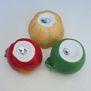 These are a set of three vintage PartyLite Fruit Splash ceramic votive or tealight candle holders, specifically designed as a green apple, a cantaloupe/melon, and a plum. They are part of the P7149 set released in the 1990s.
