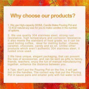 🧿UPDATED VERSION/HIGH QUALITY & SAVING YOUR TIME CANDLE MAKE POURING POT: Size 5.1inch*3.9inch* 3.6inch, Use 304 stainless steel instead of iron, strong rust resistance, high temperature and corrosion resistance. Capacity: 31oz/900ml. You can use this large pot to melt more & make more candles at one time. Perfectly fit sauce pans and smaller pots, It also meets the standard of food grade, so it can be used boiling coffee, ideal for melting butter, cheese, caramel, chocolate, candy, candle wax