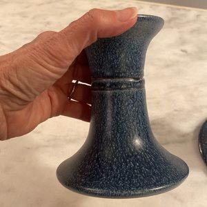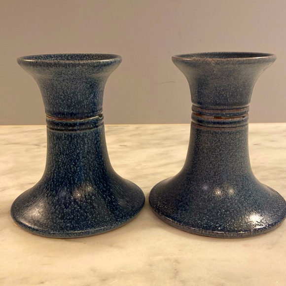 Blue, hand blown pottery, candle holders. No brand. 5” tall. Beautiful. Only call out is missing dot on bottom. Easily replaced.