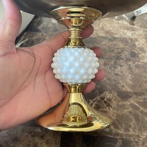 Beautiful Vintage 1950 milk glass hobnail and brass candle holders,one has a little cracked,accept offers.