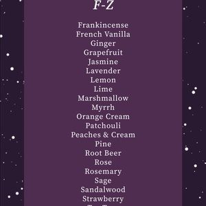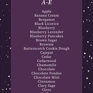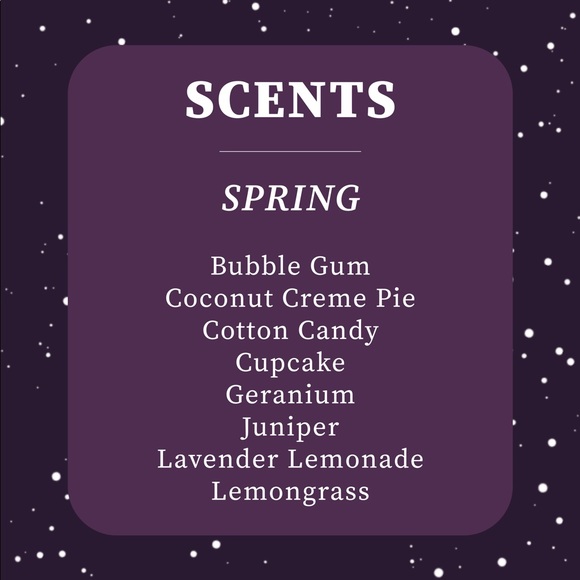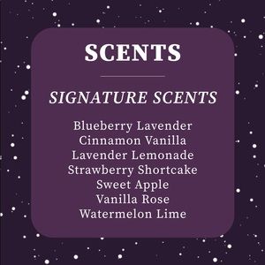 Candles in scents listed above. Different sizes available :) $6-4oz $8-6oz $12-10oz $15 - 16oz. Make me an offer for the smaller sizes as my price listing is for the largest size!