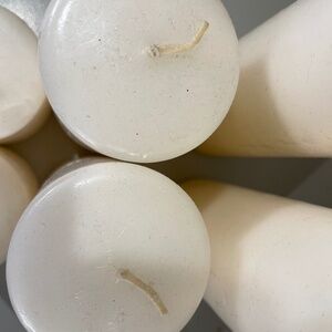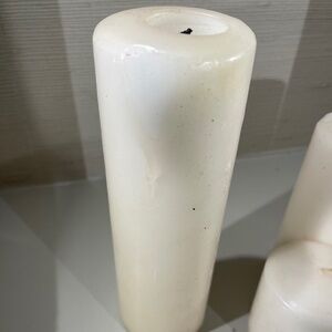 Candles. Unscented. Some slightly burned, others not burned. Two of each size--9x3, 6x3, and 3x3. One of 9x3 candles has slight damage on the side (see photo) but still usable. Good for burning or craft projects.