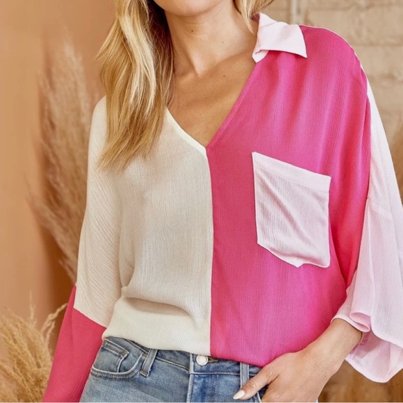 Elevate your style with this chic pink and white button down shirt. Perfect for casual outings, it offers a modern and vibrant look.