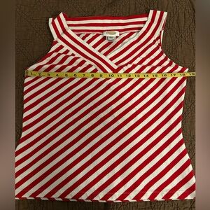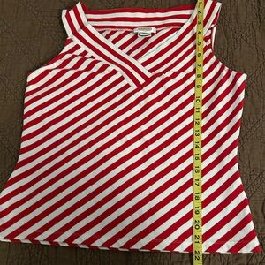 Red and white striped top feels both chic and festive. Sleeveless design. It is a size large but based on the measurements seems more like medium.