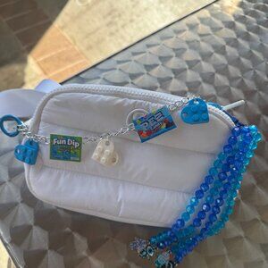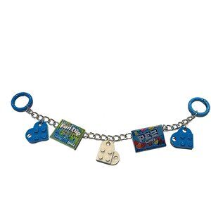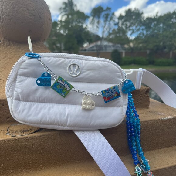 • Handmade mini bag charm featuring blue heart accents and playful candy-style charms