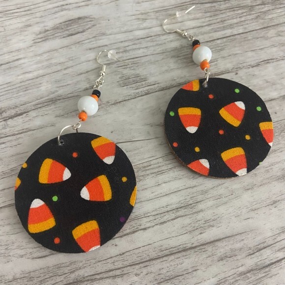 Cute pair of candy corn round earrings in black, orange tones, green and white colors. The back is covered with the same fabric and sealed.