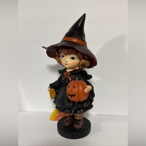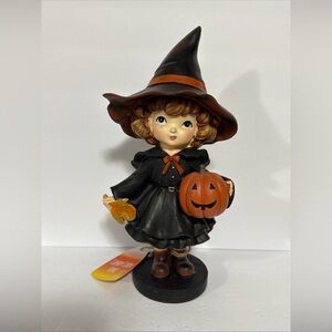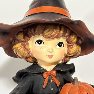 Charming witch figurine holding a pumpkin. Perfect for Halloween decor. Features a black dress and hat with orange accents.