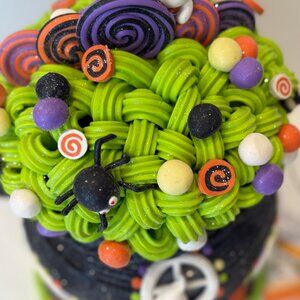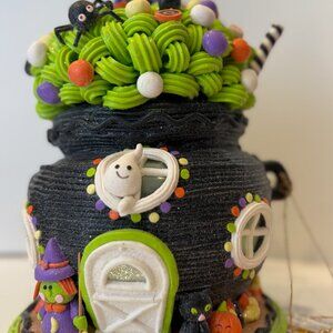 What a cute and spooky bubbling cauldron! This light-up tabletop Halloween decor piece features a black cauldron house with a lime green bubbling potion on top including lots of fun candy, a cute little spider, a witch, and some little ghosts.