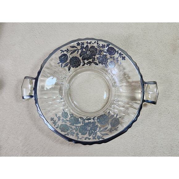 Candy Dish Clear Glass w/ handles 7 3/4" Black Floral Design Black Trim 60s Vtg