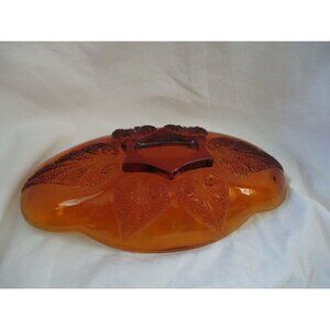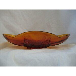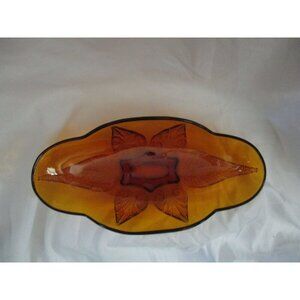 Vintage Indiana Glass Co. Deep Amber Leaf Candy/Relish Dish. Measures: 4.3ʺW × 10ʺD × 2.5ʺH. Vintage Oval, Amber Glass Relish Dish. On the Outside of the Dish is a Raised Leaf Design with a Footed Bottom. The Relish Dish measures approximately 9 3/4" Long x 4 3/4" Wide x 2 3/8" High on the Side. The Relish Dish is in Excellent condition; there are no chips or cracks.