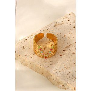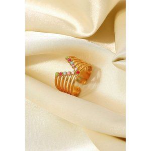Add a touch of color to your ensemble with this gold-plated stainless steel open ring that has colorful enamel decorations in a stacked V-shape.