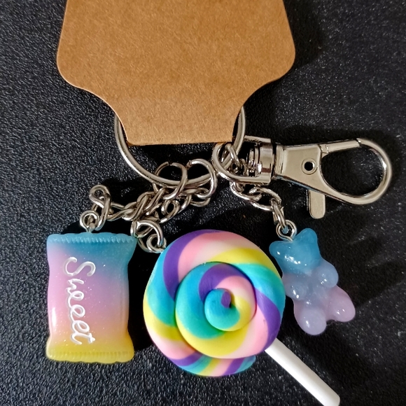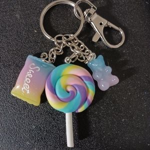 Candy Keychain with swivel clasp. Has large lollipop charm. Also has small sweet bag and gummy bear charms. Comes with colorful gift pouch!