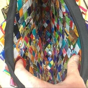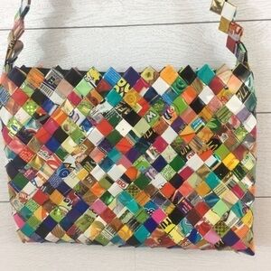 Taking your fashion recycling to the next level? Then level up with this candy wrapper purse. Hand crafted (possibly in Mexico or USA) from candy wrappers and magazines. Zip closure. Unlined.
