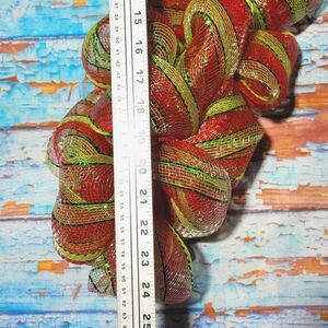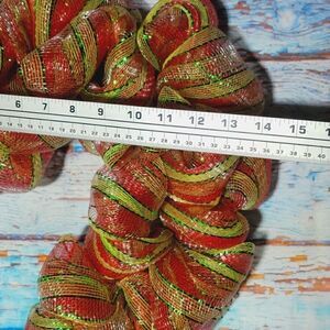 This is a handmade candy cane wreath. It's made with a metal wreath form and multi colored green and red deco mesh with metallic green accents.