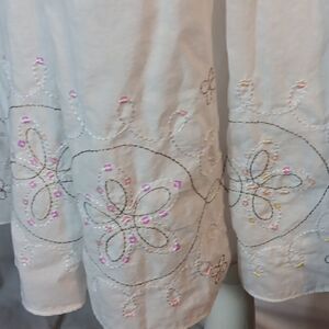 This white 100% cotton with delicate embroidery and sequins trim Candy Rain midi skirt is a size Medium with a waist measuring 14.5" and a length of 22". Has a full lining and zipper on the side. In excellent condition. All offers are welcome.