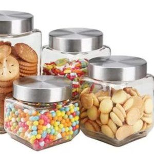 The 4-piece canister set with stainless steel lids helps to keep your dry food and snacks organized and fresh! Made with durable glass and an air-tight stainless steel lid you can neatly store your boxed food and better prevent cabinet clutter! Spot clean. Dimensions: 5”H x 10.5”W x 14”D. Material: Glass Product Height: 5" Product Width: 10 1/2" Product Depth: 14" Product Weight: 6 5/8lbs. Thanks for looking!