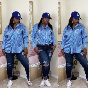 Blue and white striped button down shirt with various gold button detailing and arm cuffs. Runs slightly big. Order next size up if a "baggy" look is preferred. Two extra gold pins included. Model wearing a medium.
