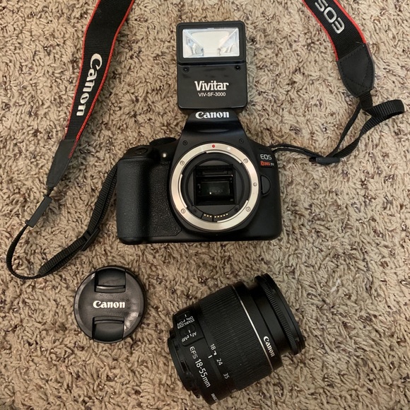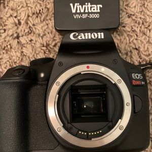 Hi there, I am selling my Canon EOS REBEL T6 camera it comes with the body and lens (EFS 18-55mm). This camera takes very good/clear photos. It is gently used & has NO wear or tear on it. I’ve also included a Vivitar VIV-SF-3000 (flash)!