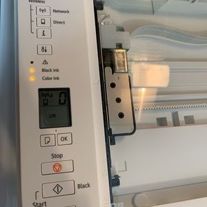 Cannon Pixma wireless all in one printer. Only used a handful of times. Really easy to set it up with an app on your phone and print things. Everything works great.